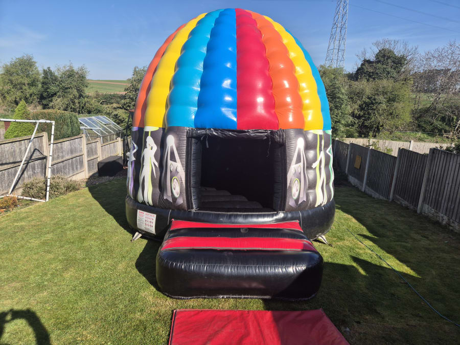 Suitable for up to 17s+, this inflatable has been the star of many parties,one of our 'Lets Party' themed Disco Dome inclusive of flashing disco lights and music through a bluetooth device this is great fun for all ages, we predict a fantastic fun time for everyone. Please allow 2 ft of clear space around the perimeter of the bouncy castle to properly inflate, we require a further 1.5ft of clear air space above the castle. Booking couldn't be easier using our 3 step online booking system. Order in advance to ensure availability' we will confirm your details with email or a text message.