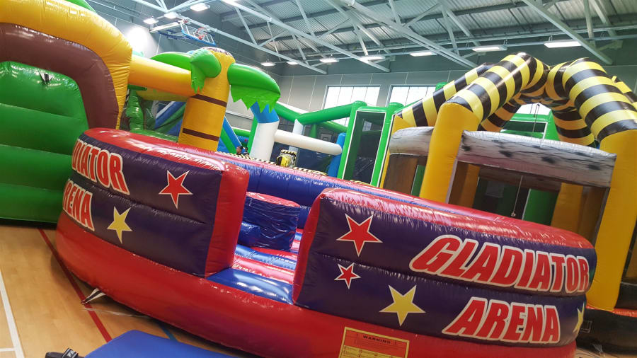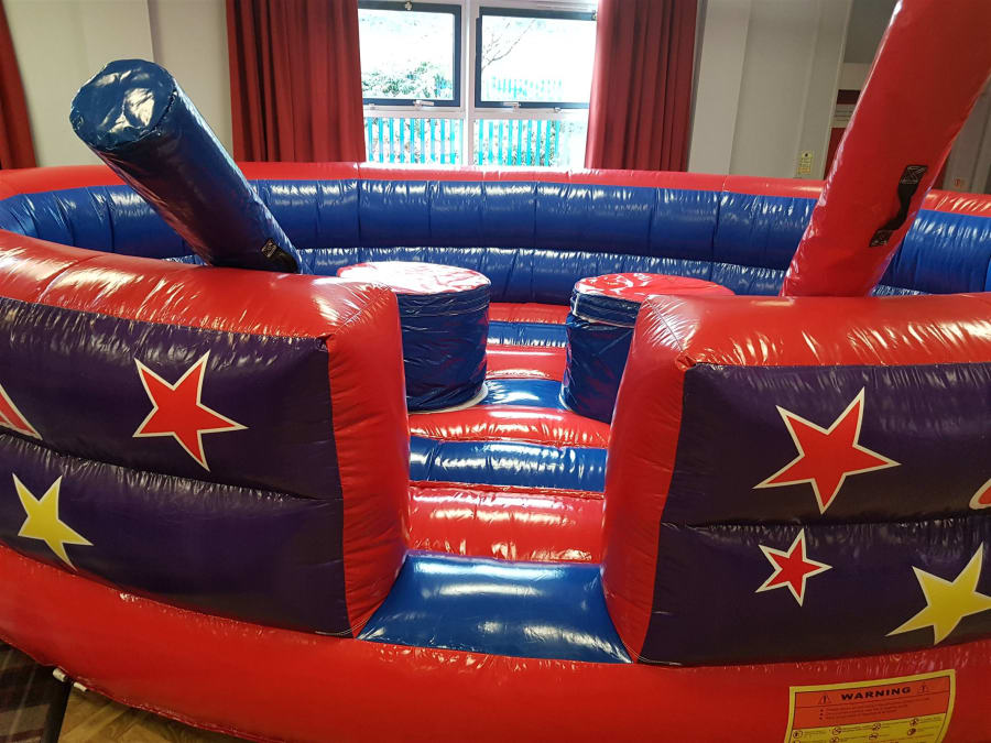 - Includes safety head wear, pugil sticks, safety crash mats, anchor stakes, 30 metre extension cabling and electric blower.