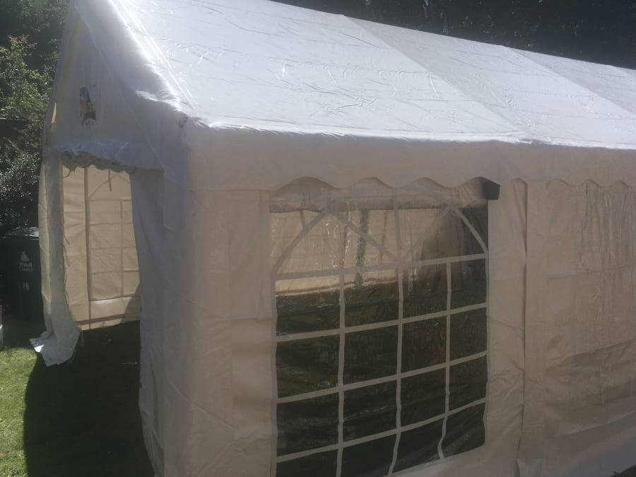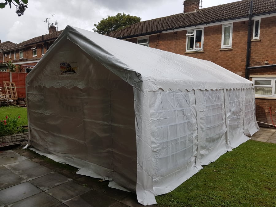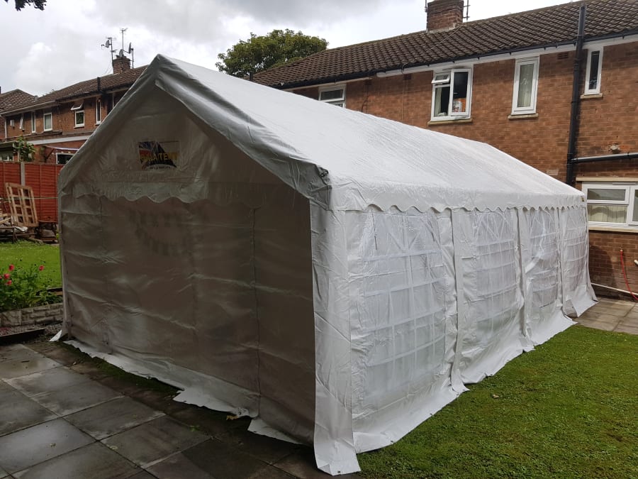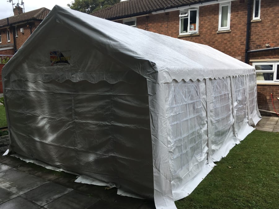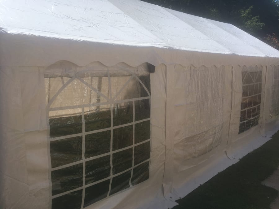 Commercial grade PVC An industry leading 650gsm PVC makes up the covers of this luxurious top-of-the-range Marquee 4M (wide) X 8M (long). The covers can be wiped clean easily, with sidewalls and end panels that connect to one another with a thick Velcro and Dutch Lacing. With the capacity to hold: